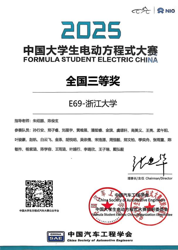 在刚刚落下帷幕的2025年蔚来杯中国大学方程式电动车大赛(FSEC)中,浙江大学能源工程学院启真车队凭借扎实的技术实力、严谨的工程实践与出色的团队协作,荣获全国三等奖。这是车队在25年赛季研发周期内克服多项困难后取得的重要突破,充分展现了我校学生在工程设计、系统集成与赛事管理等方面的综合能力。